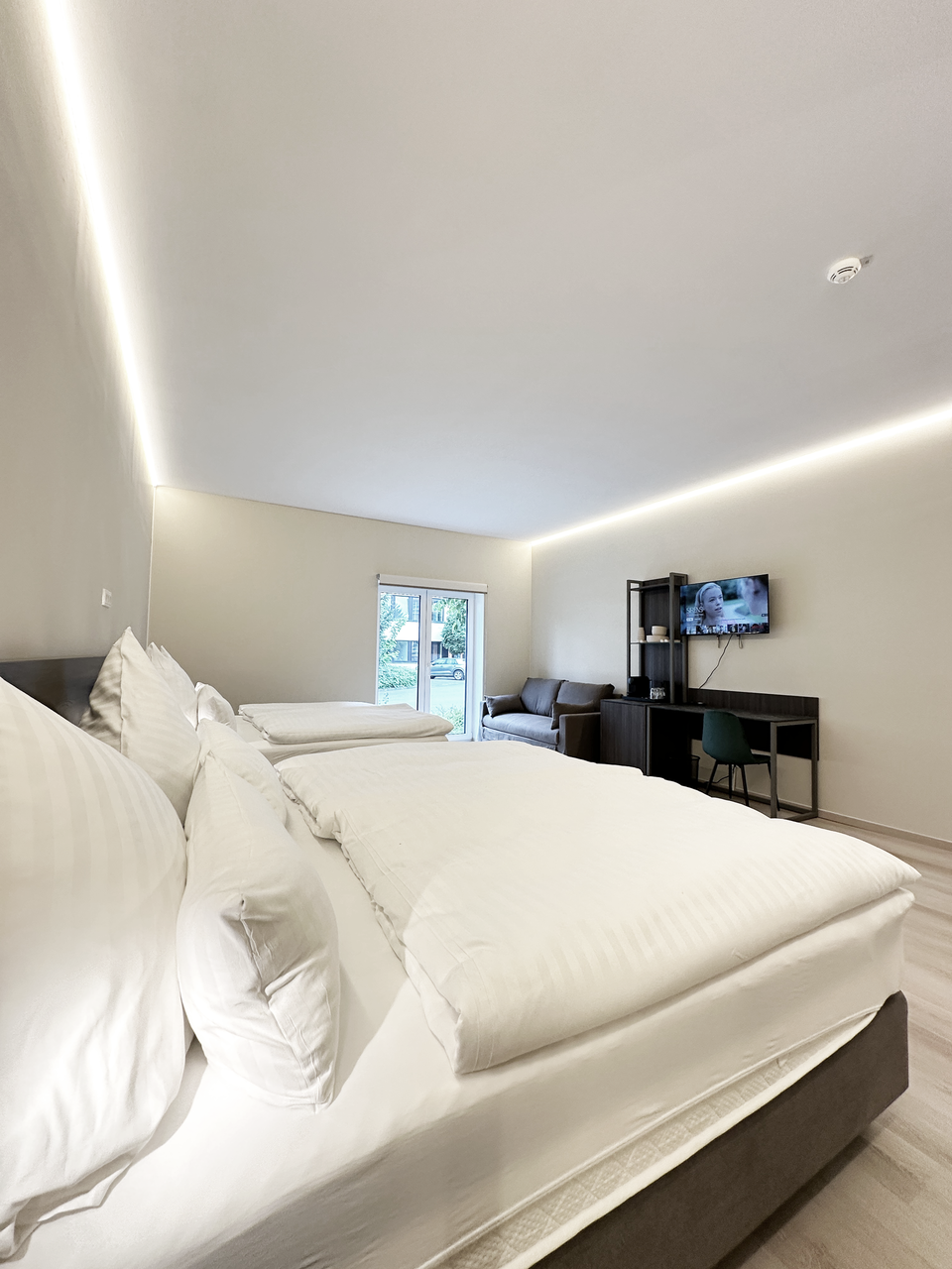 The Family Room offers everything you need for a comfortable and effortless stay in Neuss, just minutes from Düsseldorf. The Quadruple Room has four single beds, a private bathroom, Smart TV with apps like Netflix and Prime Video, wardrobe, work desk, Nespresso machine with complimentary capsules, electric kettle with teas, and a mini fridge stocked with a complimentary bottle of water.