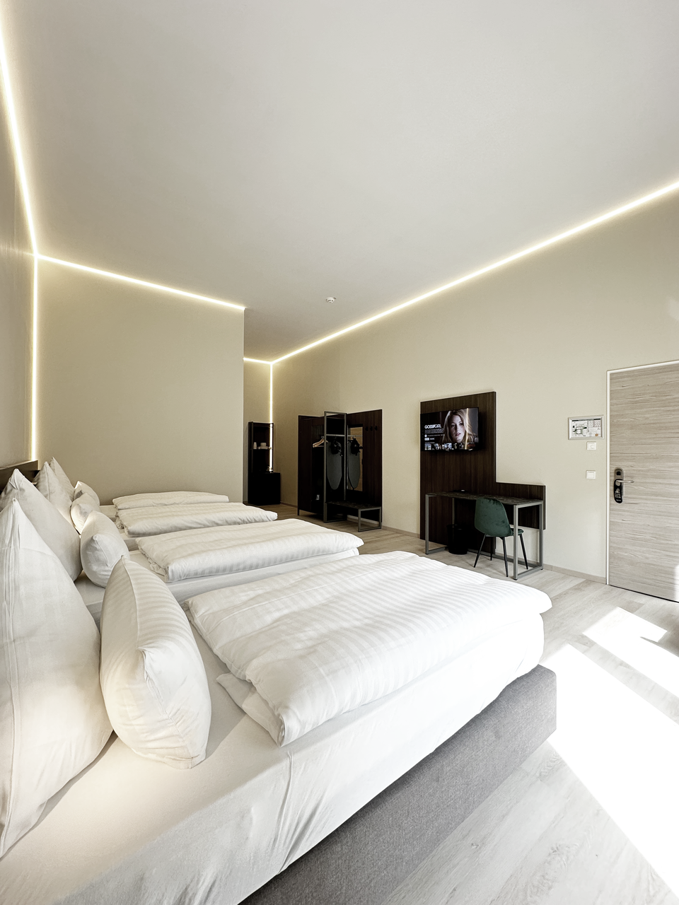 The Quadruple Room offers everything you need for a comfortable and effortless stay in Neuss, just minutes from Düsseldorf. The Quadruple Room has four single beds, a private bathroom, Smart TV with apps like Netflix and Prime Video, wardrobe, work desk, Nespresso machine with complimentary capsules, electric kettle with teas, and a mini fridge stocked with a complimentary bottle of water.